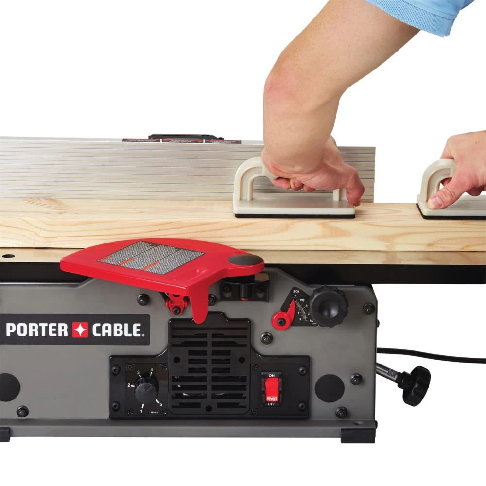 PORTER-CABLE® PC160JT Jointer features a variable speed range of 6,000 to 11,000 RPM and cutter head speed of 12,000 to 22,000 cuts per minute, allowing selection correct speed for material’s size and hardness. Two-knife cutter head, with jackscrew knife leveling arrangement and built-in cutter head lock, allows for easy knife replacement and adjustment. Jointer is ideal for edging, flattening, or face jointing.