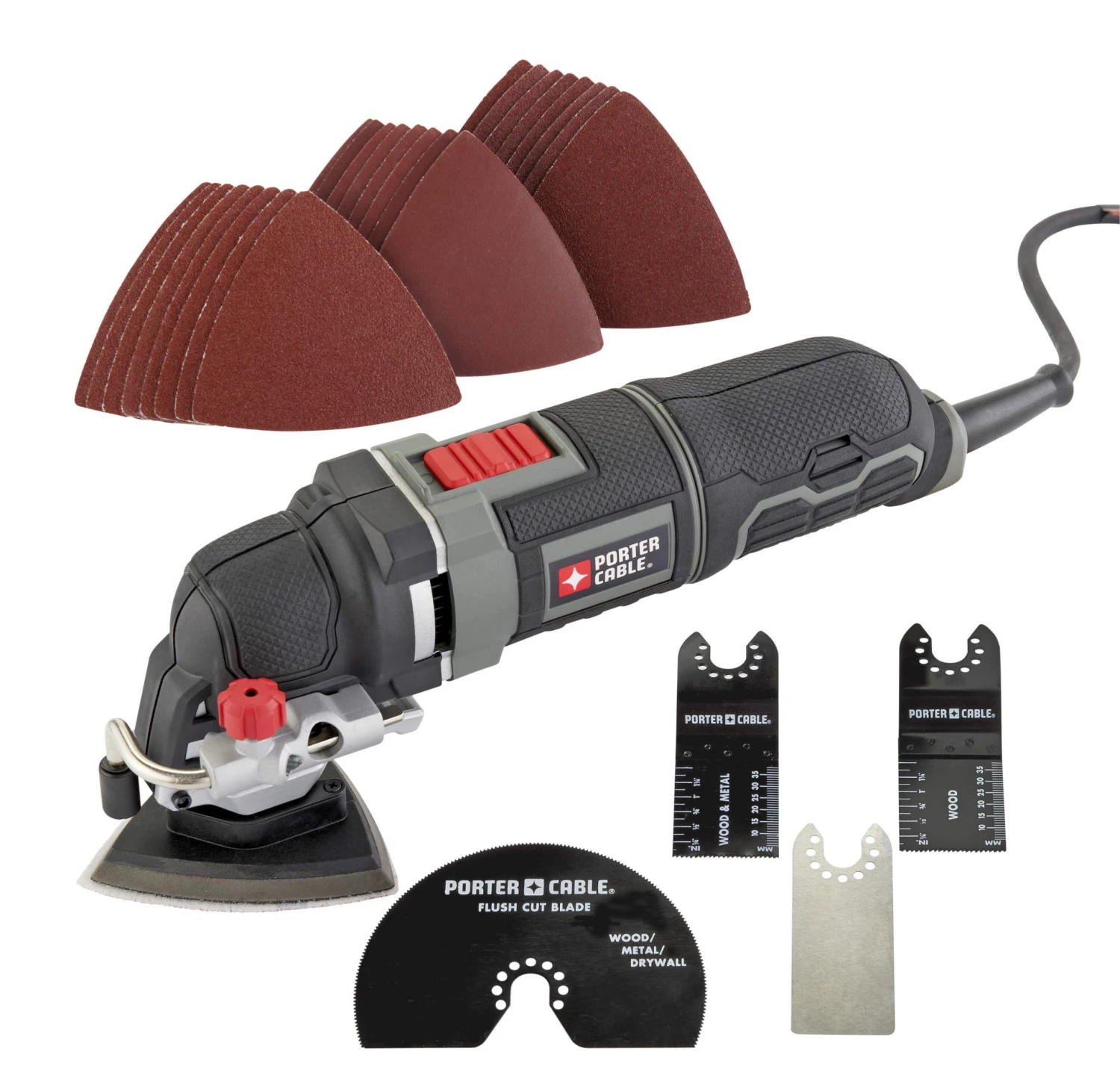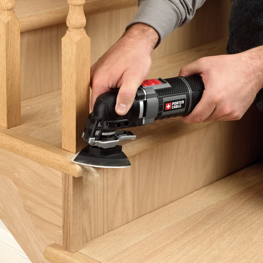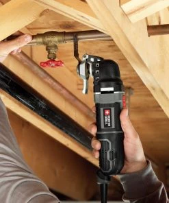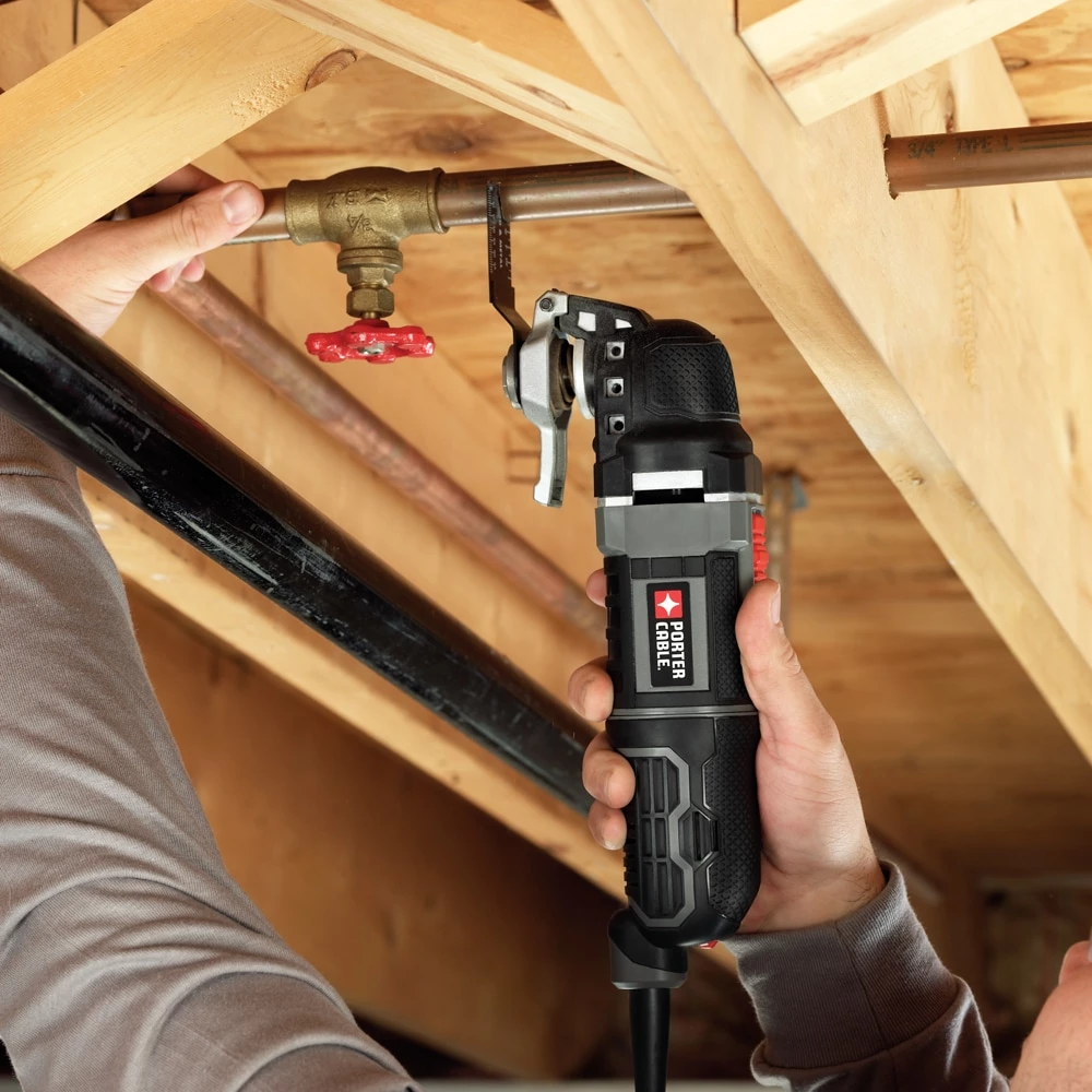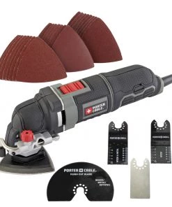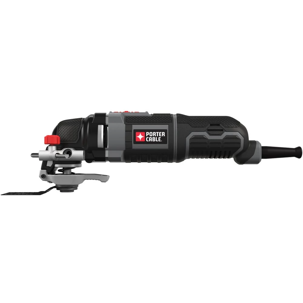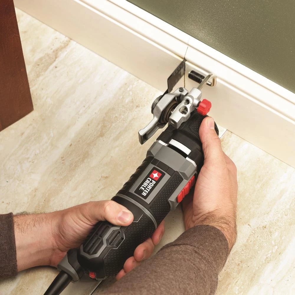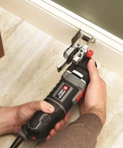 If you’re faced with a project involving cutting, sanding, scraping or grinding, then this PORTER-CABLE oscillating tool kit is the one to help you get the job done. The tool’s 3-amp motor with variable-speed dial delivers optimal performance and control over different projects in a variety of materials. With the TOOL-FREE SYSTEM™, accessory changes are simple and fast, and keep you from fumbling with bolts or wrenches. Its convenient depth and cutting guide is perfect for projects like cutting through drywall with electrical behind it, the guide only allowing the blade to go so far. The 10-ft cord allows for farther reach without needing an extension cord. Gripping on the front, middle and rear of the tool reduces vibration and offers comfort while in use. For tackling a variety of jobs around the home or jobsite, choose this oscillating tool kit.