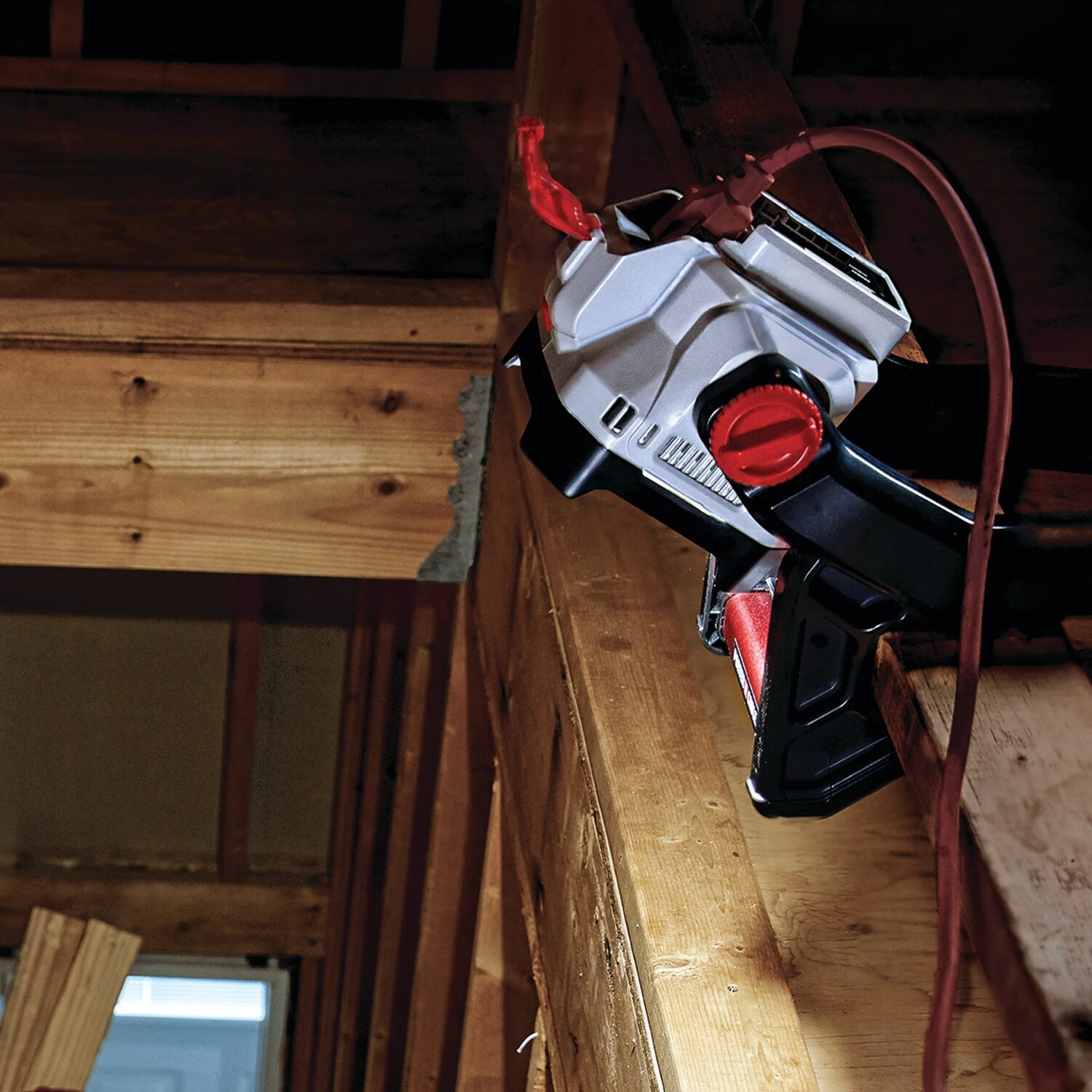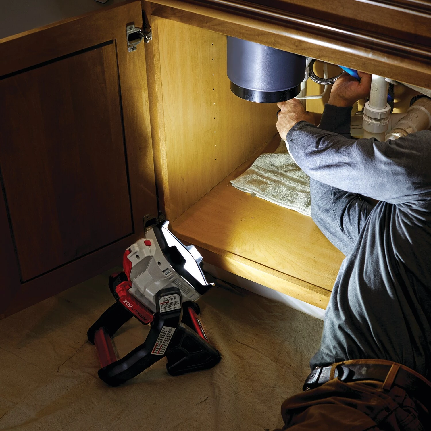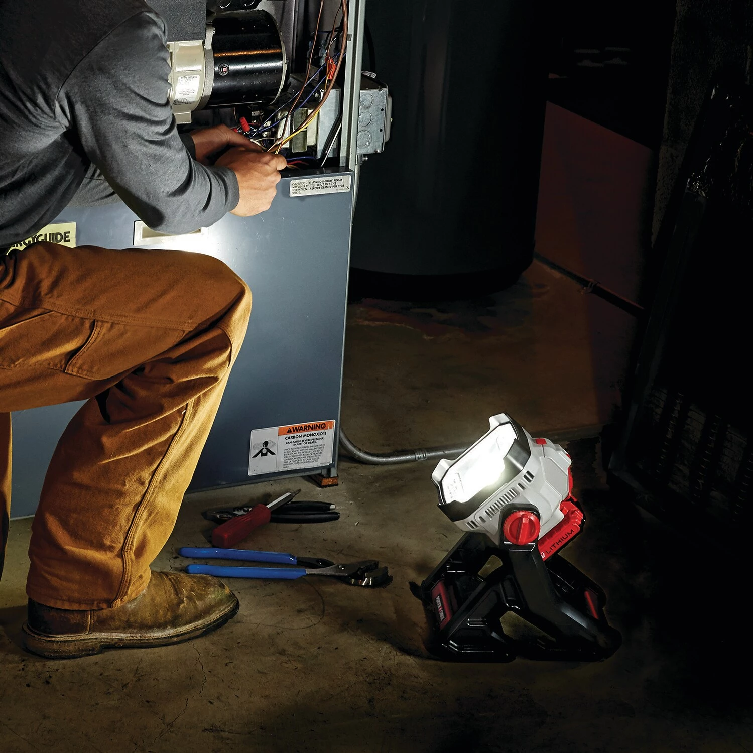 The PORTER-CABLE® 20 V MAX corded/cordless LED task light is your portable, versatile solution for lighting your work. Efficient LEDs provide up to 1900 lm of natural white light without the heat of halogen bulbs. It’s compatible with all PORTER-CABLE 20 V MAX battery packs for convenient, cordless operation. Use an extension cord with the AC input for corded use. Durable construction and long-lasting LEDs keep your light shining from job to job. Point the light where you need it with the 360Β° tilting head. Use it freestanding, mounted onto a tripod, wall-mounted, attached to a 2 x 4, or cable-hung. Two brightness levels let you choose the right amount of light for the conditions and the runtime you need.