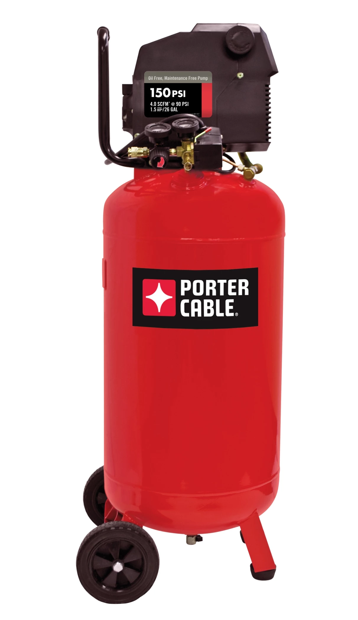 - PORTER-CABLE 26-gal, 150-PSI vertical, portable electric air compressor is perfect for use with a wide variety of air tools and accessories on the go