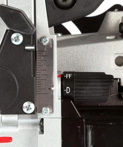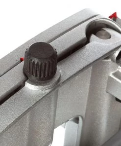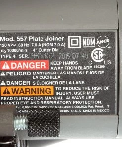 PORTER-CABLE® deluxe plate joiner features 7.5 Amp motor, which generates 10,000 RPM. Its 1 In. outside diameter dust port accepts standard bag or can be connected to a vacuum. Fence tilts from 0-135 degrees, with positive adjustable stop at 90 degrees. Includes precise micro height-adjustment knob, lock-on trigger. Height scale is accurate at any angle. Seven-position rotating depth stop for FF, #0, #10, #20, simplex, duplex, and max (#6) biscuits. Spindle lock for easy blade changes. Bale handle attached to fence rather than motor, for greater stability and added control during cuts.
