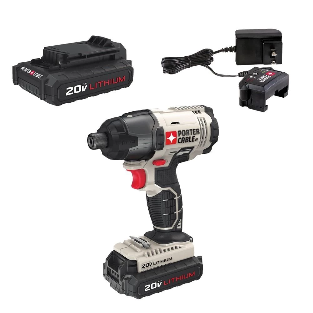 Porter-Cable 20-volt MAX Li-ion compact impact driver. High torque motor delivers 1450-in/lbs of torque. Compact (6.9-in long) and light weight (3.3 lbs) allows tool to work in tight areas and minimizes user fatigue. Battery gauge displays remaining charge. LED light brightens dark work areas.
