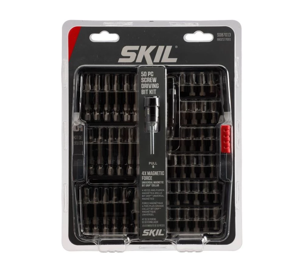 The SKIL 50-piece screwdriving bit set offers an assortment of the most commonly used screw driving bits for a variety of projects. Plus the patented, Bit Grip™ Magnetic Bit Collar holds screws securely for one-handed use. Simply slide the collar onto a 2-inch impact bit for 4X magnetic force to hold fasteners securely. Includes a convenient carrying case to keep your bits organized and easy to access.